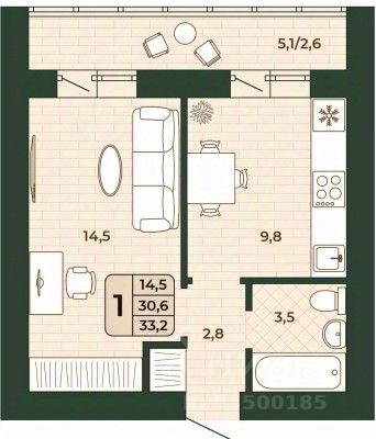 Продаётся 1-комнатная квартира в строящемся доме (дом 5), срок сдачи: IV-кв. 2026, общей площадью 30.6 кв.м., на 6 этаже.