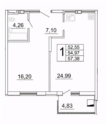 - общая площадь с учетом балконов и лоджий - 38,50 кв.м.