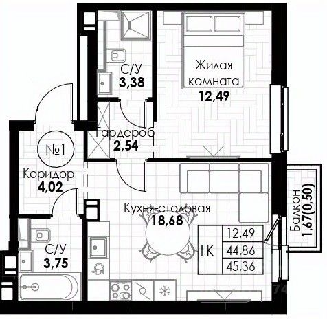 Продаётся 1-комнатная квартира в строящемся доме (Корпус 1), срок сдачи: IV-кв. 2028, общей площадью 45.36 кв.м., на 2 этаже.