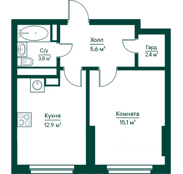 - Просторная кухня (12 м2), площадь которой позволяет сделать из нее кухню-гостиную;