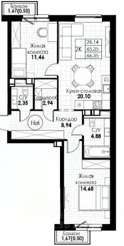 Продаётся 2-комнатная квартира в строящемся доме (Корпус 1), срок сдачи: IV-кв. 2028, общей площадью 66.35 кв.м., на 2 этаже.