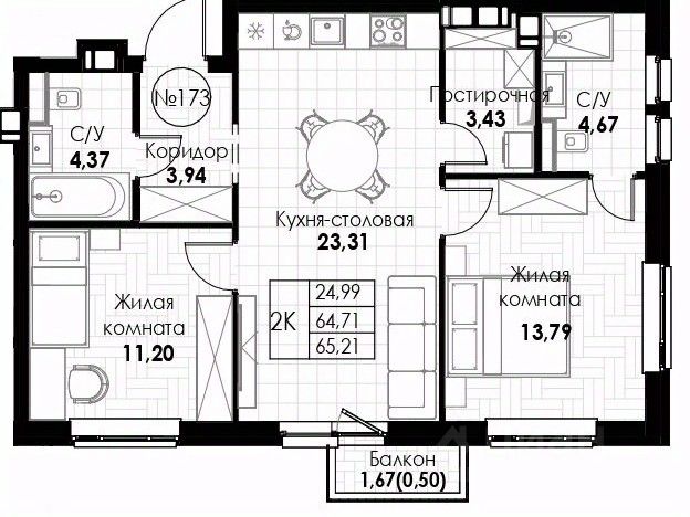 Продаётся 2-комнатная квартира в строящемся доме (Корпус 1), срок сдачи: IV-кв. 2028, общей площадью 65.21 кв.м., на 2 этаже.