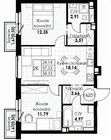 Продаётся 2-комнатная квартира в строящемся доме (Корпус 1), срок сдачи: IV-кв. 2028, общей площадью 58.33 кв.м., на 3 этаже.