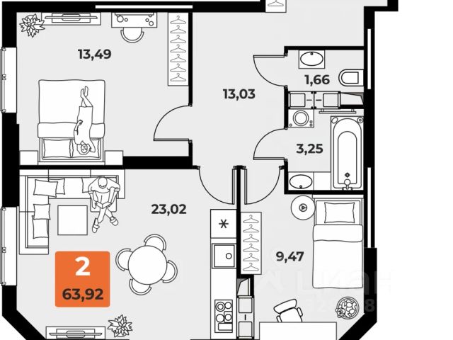 По выписке из Единого государственного реестра недвижимости, площадь квартиры составляет 75,6 квадратных метра. Кухня гостиная - 27.2 кв.м Комнаты 18.5 и 17.08 кв.м Два с/у 3.5 и 2.7 кв.м .