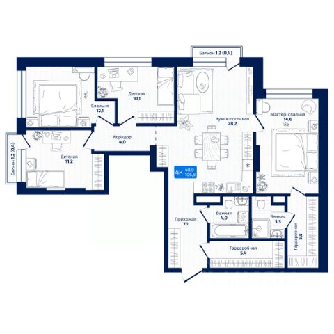 Общая площадь квартиры 78,1, из них: зал - 17,5 м2, две спальни по 14,2 м2 (обе с балконами), кухня - 8 м2, санузел - раздельный, есть небольшая кладовая - 2 м2, высота потолков 3 м.