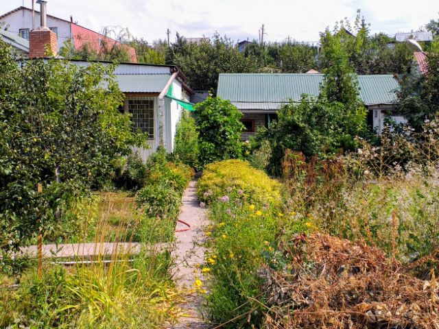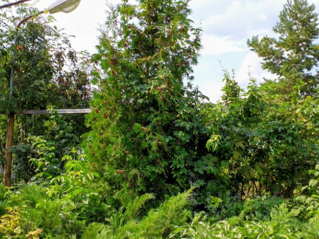 * Для души: Плодовые деревья (яблоня, слива) и кусты малины. По периметру — забор,елка,туи.