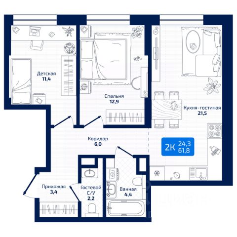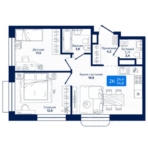 Планировка - зал и кухня 26 кв.м., спальня 12 кв.м , детская 15 кв.м. Санузел раздельный. Есть гардеробная.