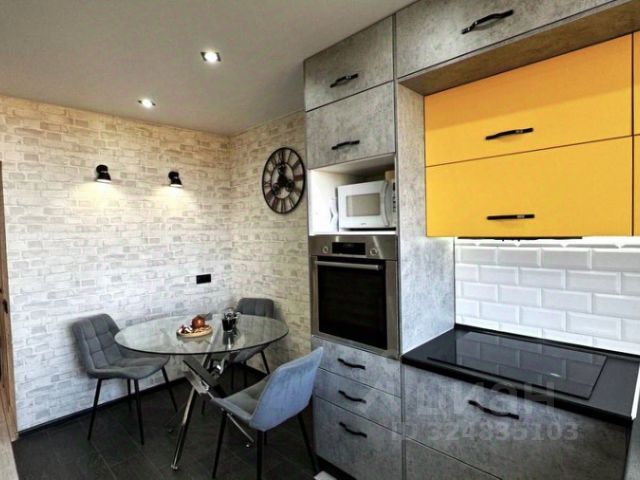 Кухня, совмещенная с гостиной, оборудована мебелью производства Италии, и стеклянной, закрывающей кухню от гостевой комнаты, перегородкой. В гостиной балкон. В квартире много встроенных шкафов- гардеробных, что позволяет разместить большое количество вещей. Вся встроенная мебель производства Германии. Пол на кухне, прихожей и ванной с подогревом, материал - импортная плитка.