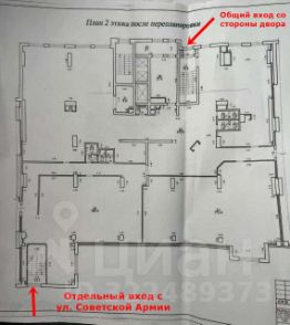 Планировка свободная, с возможностью организации пространства под свои нужды. Высота потолка 3,2 метра, что создает ощущение простора. Выделенная электрическая мощность 75 кВт. Несколько мокрых точек. Естественное освещение создается благодаря большому количеству окон. Два входа: отдельный со стороны ул. Советской Армии и второй общий со стороны двора.