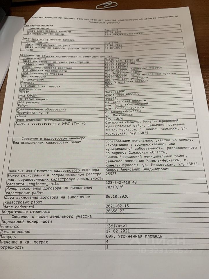 аукцион на право заключения договора аренды земельного участка площадью 26 кв.м., имеющего кадастровый номер 63:23:1104041:907, с разрешенным использованием: хранение автотранспорта, расположенного по адресу: Самарская область, Кинель-Черкасский муниципальный район, сельское поселение Кинель-Черкассы, с. Кинель-Черкассы, ул. Московская, з/у 13В/4