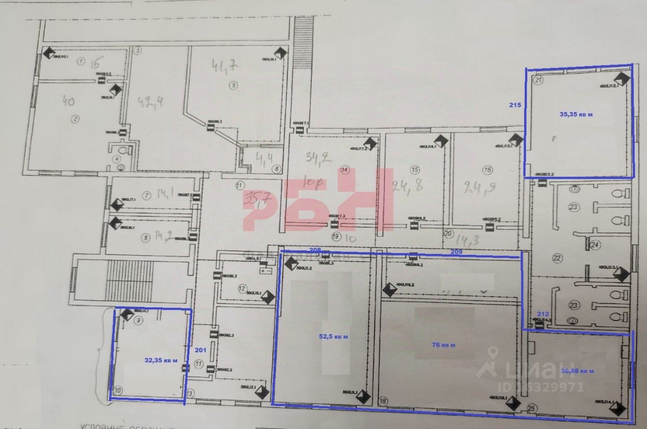 -кабинетная система на этаже (площади кабинетов: 32. 35+52. 5+76+36. 88+35. 35 кв м) в одном кабинета выведена мокрая точка;