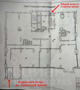 Планировка свободная, с возможностью организации пространства под свои нужды. Высота потолка 3,2 метра, что создает ощущение простора. Выделенная электрическая мощность 75 кВт. Несколько мокрых точек. Естественное освещение создается благодаря большому количеству окон. Два входа: отдельный со стороны ул. Советской Армии и второй общий со стороны двора.
