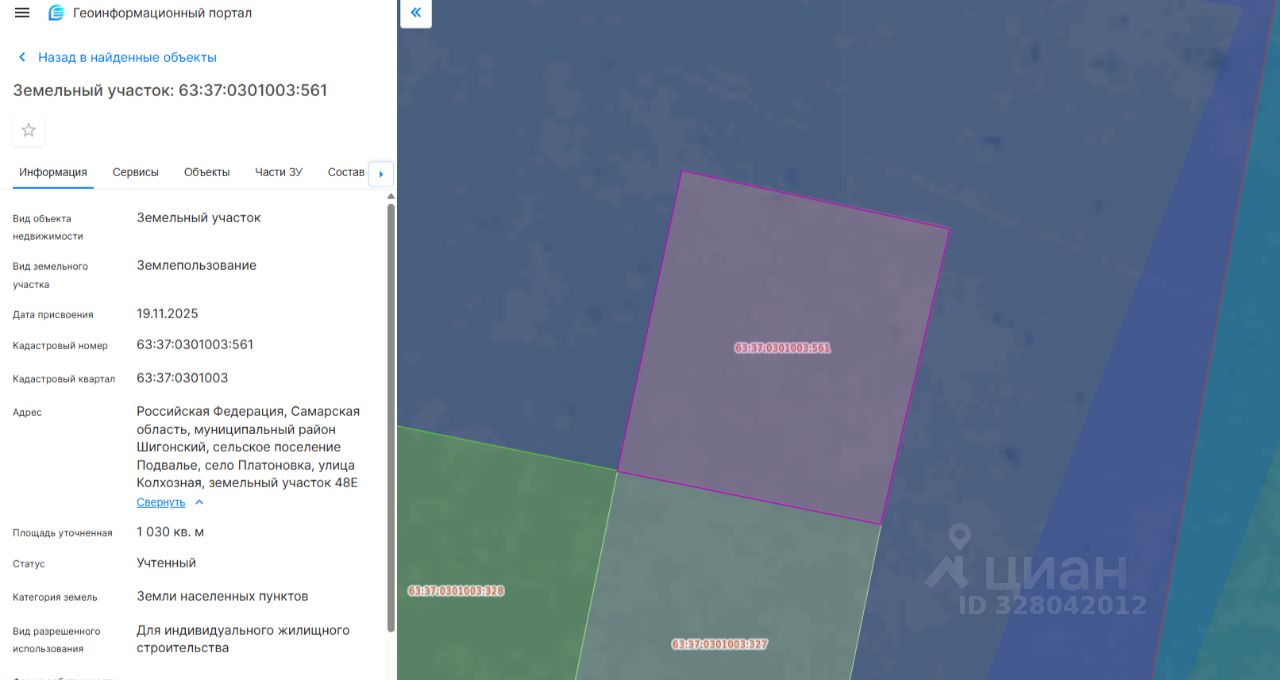 Кадастровый номер земельного участка: 63:37:0301003:561 Местоположение земельного участка: Российская Федерация, Самарская область, муниципальный район Шигонский, сельское поселение Подвалье, село Платоновка, улица Колхозная, земельный участок 48Е. Площадь земельного участка 1030 кв.м. Разрешенное использование земельного участка: для индивидуального жилищного строительства. Земельный участок относится к категории земли населенных пунктов.