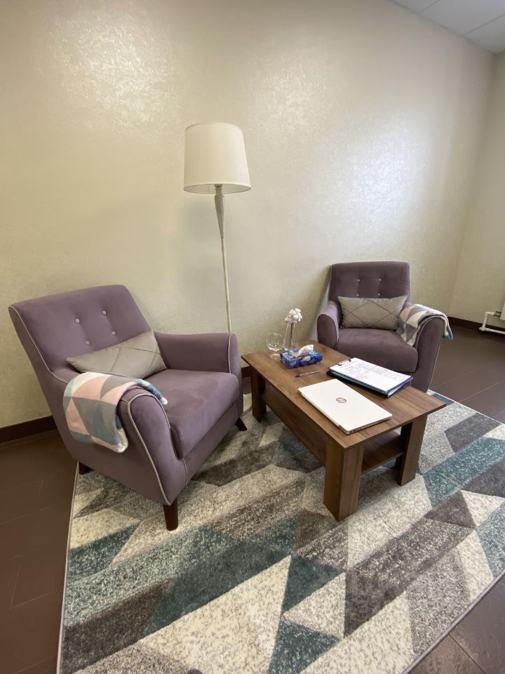 1. Зона терапии и бесед: Два мягких кресла, пледы, журнальный столик, уютный ковер и торшер для создания доверительной атмосферы.