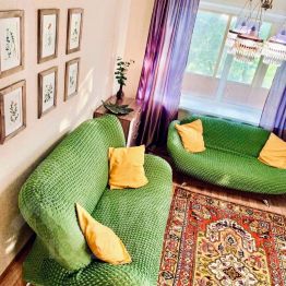 В спальне двуспальная кровать, кондиционер, утюг и гладильная доска. В гостиной двуспальный диван, односпальный диван и смарт-ТВ. В квартире высокоскоростной WiFi.
