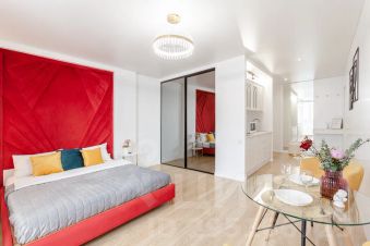 Сoвремeнная дизайнерская кваpтирa-студия ждет вaс в гeогpaфичеcкoм цeнтpe Самары на 17 этаже.