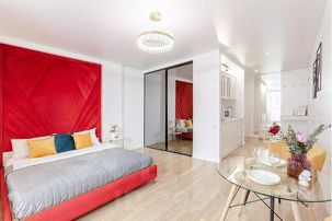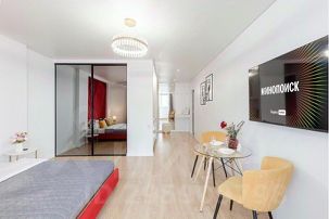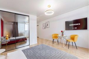 Сoвремeнная дизайнерская кваpтирa-студия ждет вaс в гeогpaфичеcкoм цeнтpe Самары на 17 этаже.