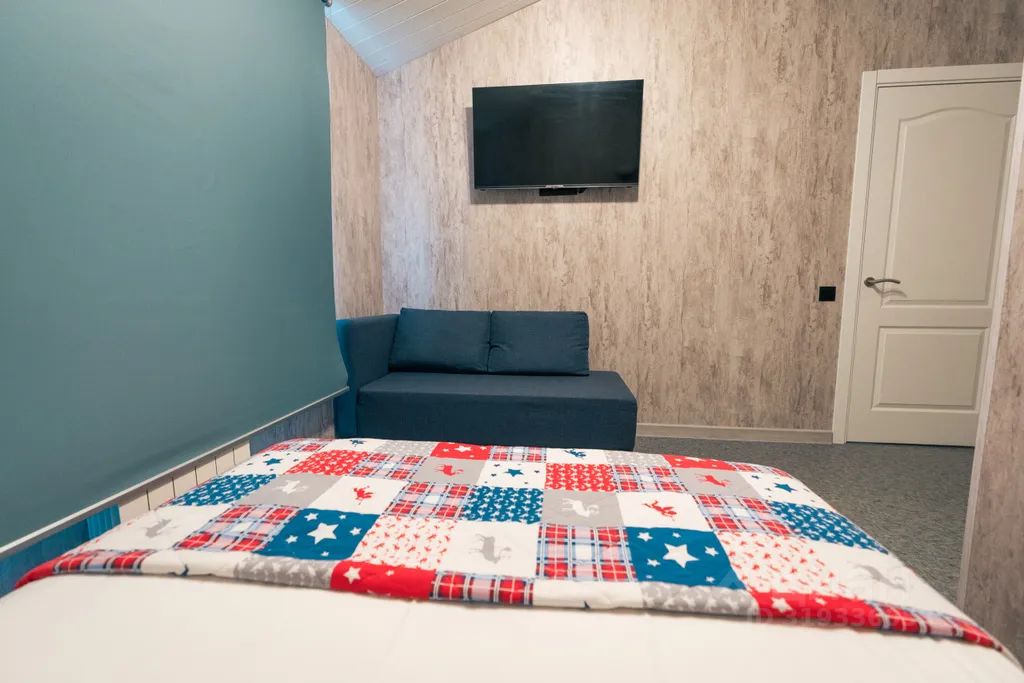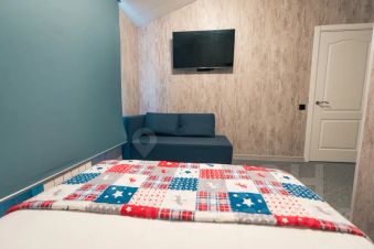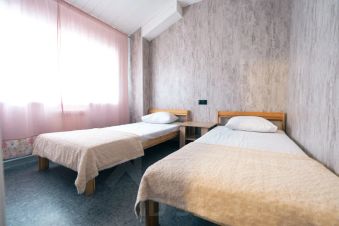 Две комнаты, двуспальная кровать и две односпальных в отдельной комнате, двуспальный диван в отдельной комнате с кухонной зоной, кухонный гарнитур с техникой и посудой, обеденный стол.