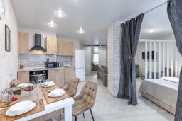 Для проживания есть все необходимое: двуспальные кровати, удобный раскладной диван, холодильник, электроплита, вытяжка, электрический чайник,