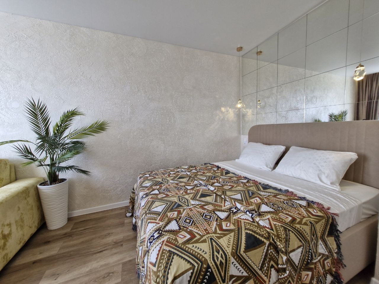 В квартире оборудованы: кухня, спальня, ванная комната, душ, вместительная гардеробная, водоснабжение (горячее, холодное), освещение.