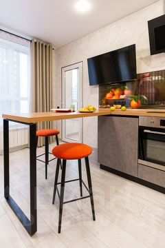 -светлая кухня со всем техническим оснащением (холодильник, чайник, микроволновая печь, духовой шкаф, плита, посуда, кофе и чай, сахар), мягкой зоной, телевизором. Для комфортного завтрака, обеда, и ужина можно комфортно разместиться на мягком диване с ноутбуком, если Вы в деловой поездке, к Вашим услугам бесплатный Wi-Fi .