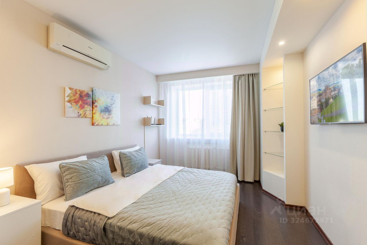 В апартаментах возможно размещение до 6 человек, спальные места - широкая двуспальная кровать и два раскладных дивана. Для проживания есть все необходимое: посуда, Smart TV, Android, бесплатный Wi-Fi, холодильник, электроплита + вытяжка, духовой шкаф, электрический чайник, микроволновая печь, телевизор, электроводонагреватель, стиральная машина, постельное белье, полотенца, фен, средства личной гигиены, бытовые моющие средства, утюг, гладильная доска, сушилка для белья, чай, кофе, сахар, соль, перец, масло. Лоджия с видом на Волгу.
