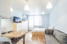 Апартаменты-студия подойдут для размещения 4 гостей. В квартире имеется все необходимое для комфортного проживания: постельное белье и полотенца, гигиенические принадлежности, кухонная и столовая посуда для приготовления и приема пищи, гладильная доска. Спальные места: двуспальная кровать и раскладной двуспальный диван. Из техники: микроволновка, плита и духовой шкаф, чайник, холодильник, телевизор и Wi Fi, стиральная машина, фен, утюг. В доме есть лифт.