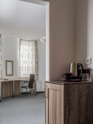 Для бронирования доступны номера категорий Стандарт, Улучшенный, Полулюкс и Апартаменты. В каждом из них есть все необходимое для комфортного проживания: телевизор, телефон, кондиционер, сейф, мини-бар, чайный набор, письменный стол, собственная ванная комната с феном, тапочками, комплектом полотенец и косметическими средствами. В апартаментах имеется оборудованная кухонная зона с набором посуды. На всей территории предоставляется Wi-Fi.