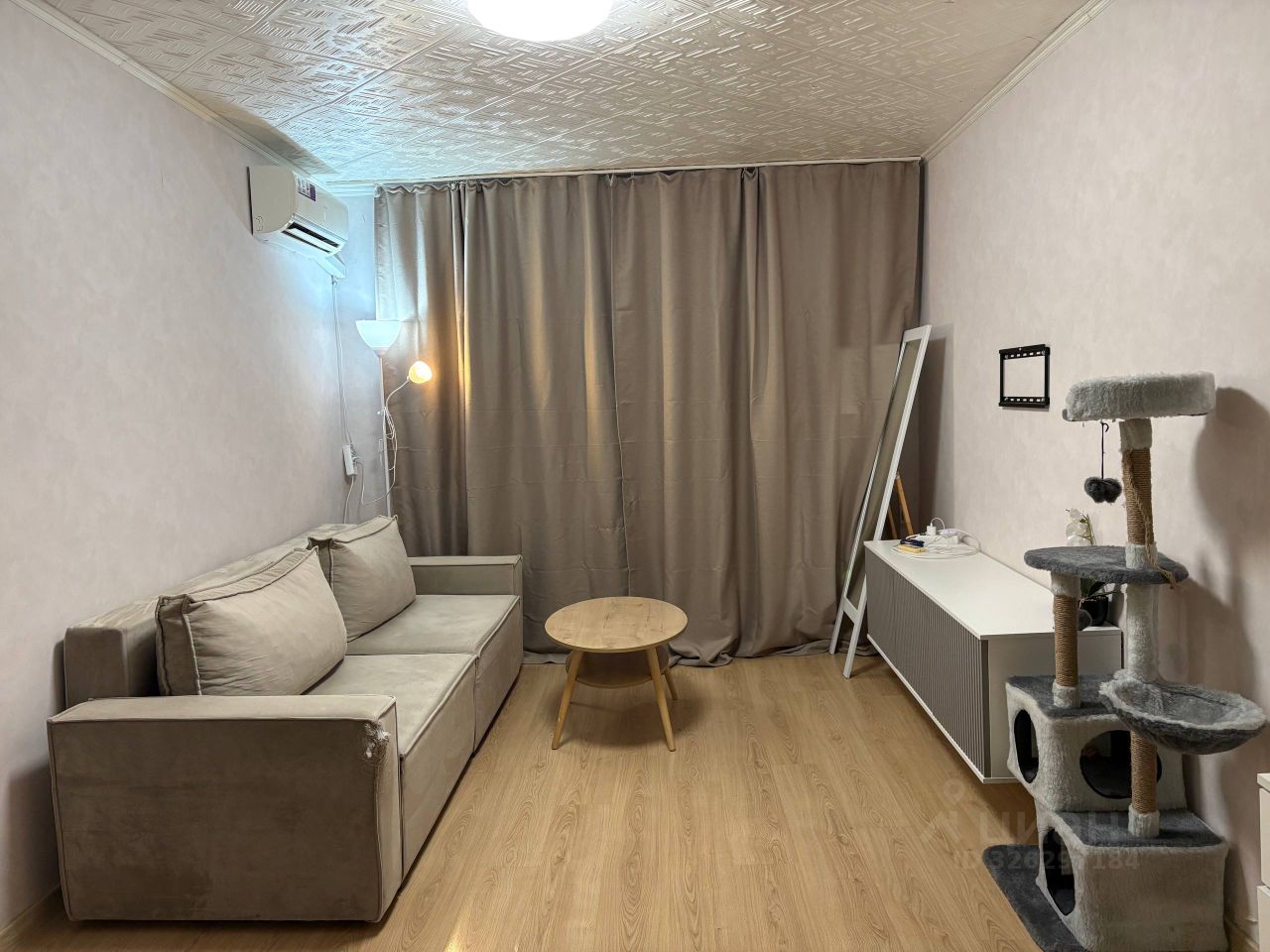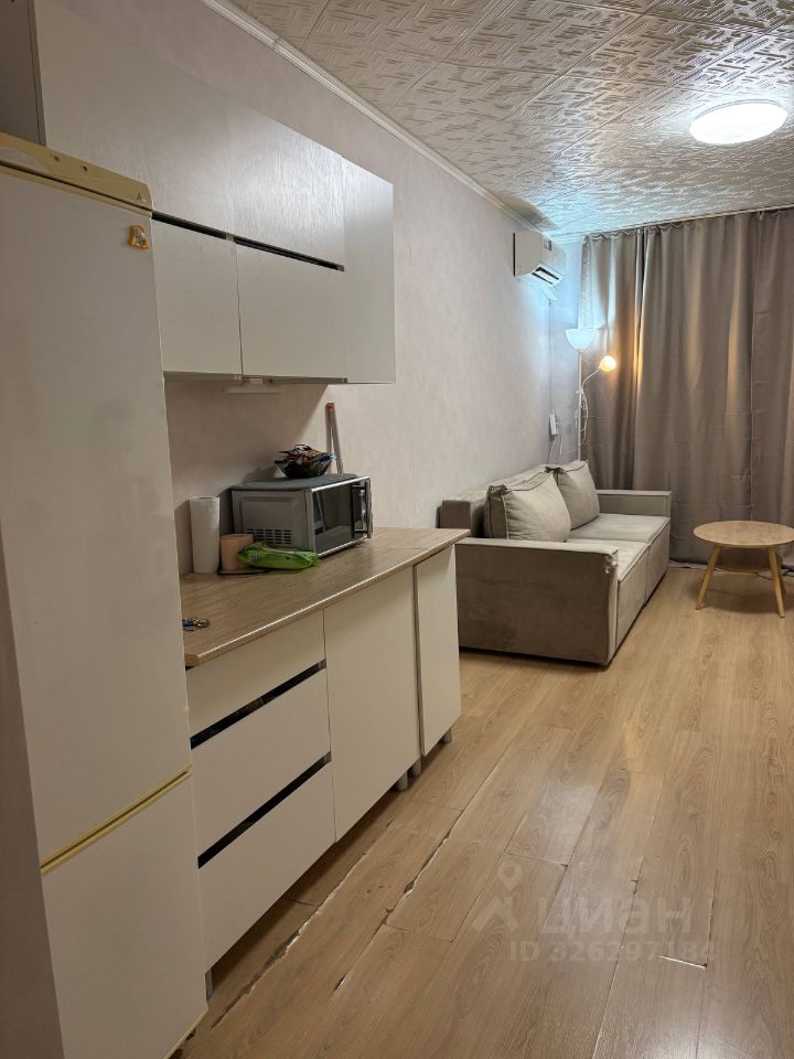 В комнате есть всё необходимое для комфортного проживания: раскладной диван, тумба под телевизор, большой шкаф, комод, кухонный гарнитур, микроволновая печь, холодильник, кондиционер. Вся мебель новая, приобреталась во время ремонта.