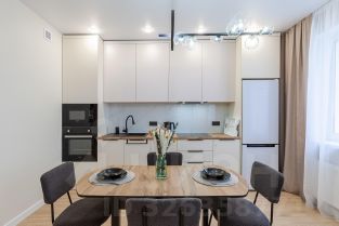Кухня со всем необходимым: индукционная плита, микроволновая печь, электрической чайник, холодильник, посудомоечная машина а так же посуда, приборы, чай, кофе, сахар и масло подсолнечное.