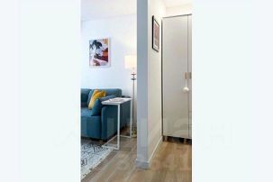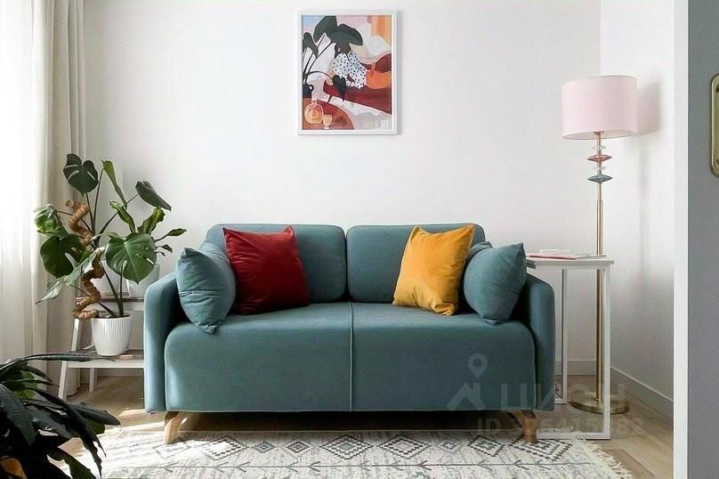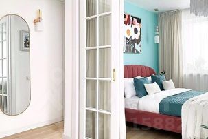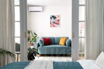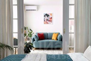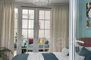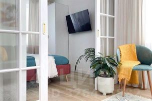 Гостиная-спальня: большой телевизор 43 дюйма по диагонали со Smart TV с онлайн-кинотеатром Kion, кондиционер, WI-FI, двуспальная кровать (140х200 см), двустворчатый шкаф, прикроватные тумбочки, двуспальный диван-кровать (140х200 см), столик для ноутбука, торшер, кресло. Зона с кроватью закрывается дверями и бархатными шторами.