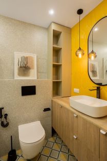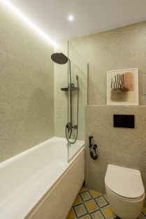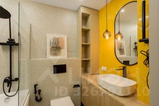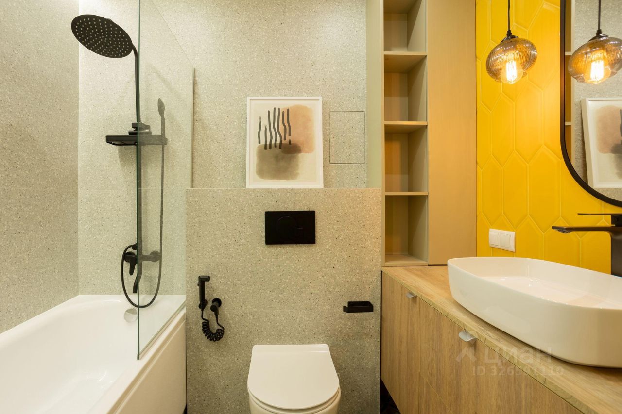 Санузел: полноразмерная ванна с тропическим душем, стены выполнены из премиального керамогранита, дорогая мебель в ванной на заказ.