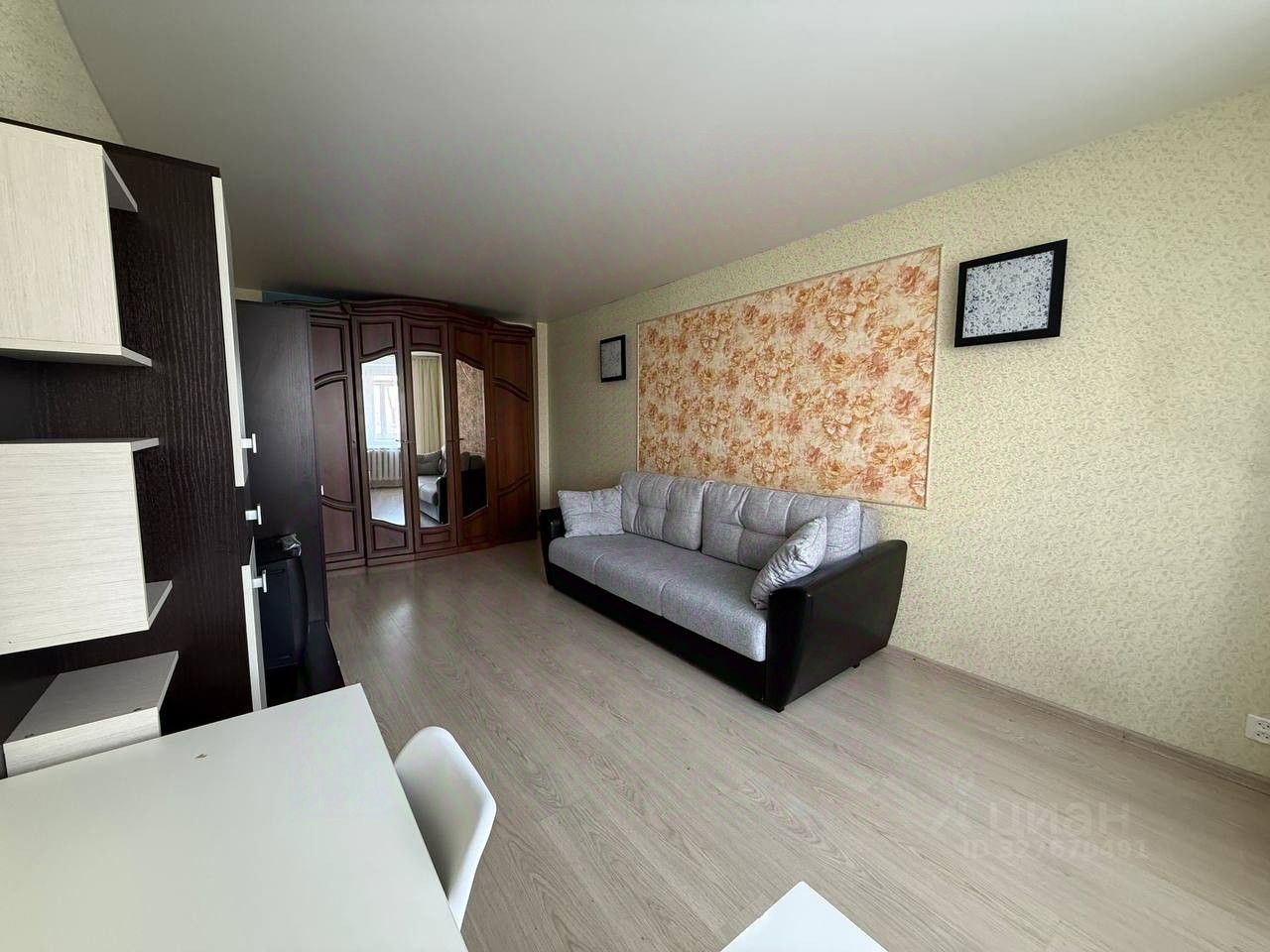 В комнате установлен удобный диван и вместительный шкаф, а также имеется рабочий стол. Кухня имеет рабочую и обеденные зоны, холодильник и плиту. Совмещенный санузел оснащен душевой кабиной и стиральной машиной.
