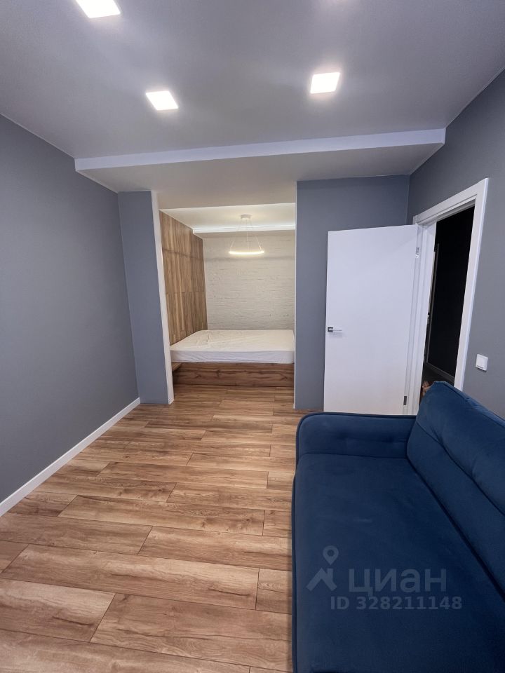 В комнате выполнено зонирование спального места. Из одной большой комнаты получается 2: спальня и гостиная, в которой расположен диван. При желании можно будет повесить телевизор. Также в квартире тёплый балкон, можно использовать под рабочий кабинет.