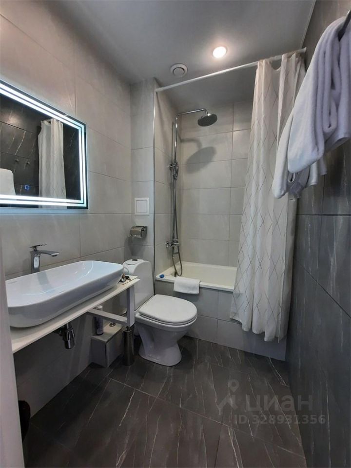 Санузел с ванной полотенца 3 шт., фен, туалетные принадлежности.