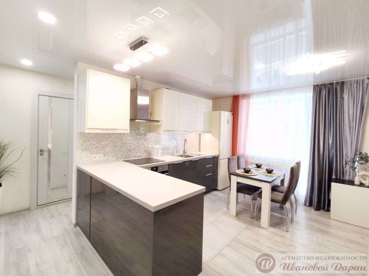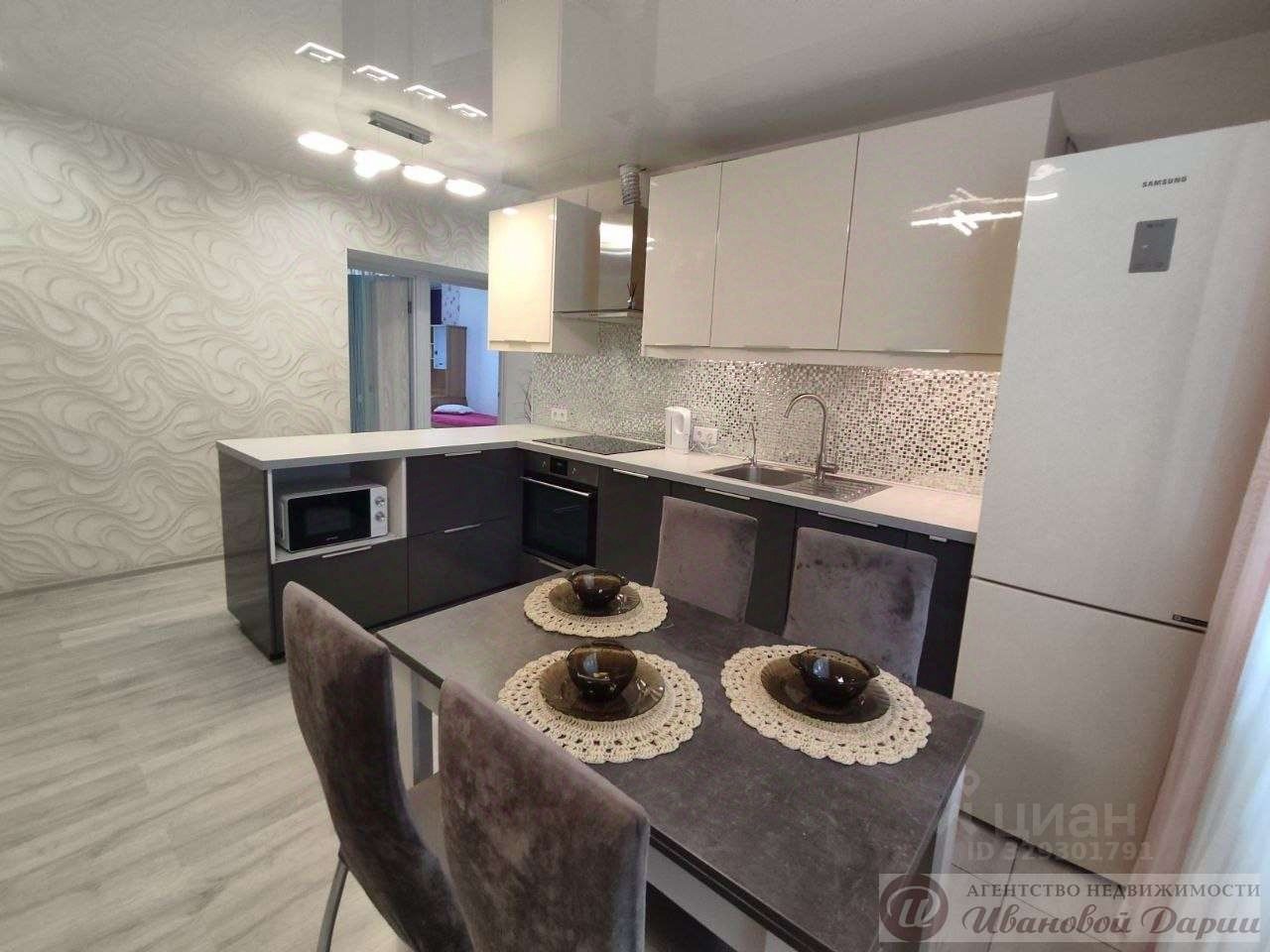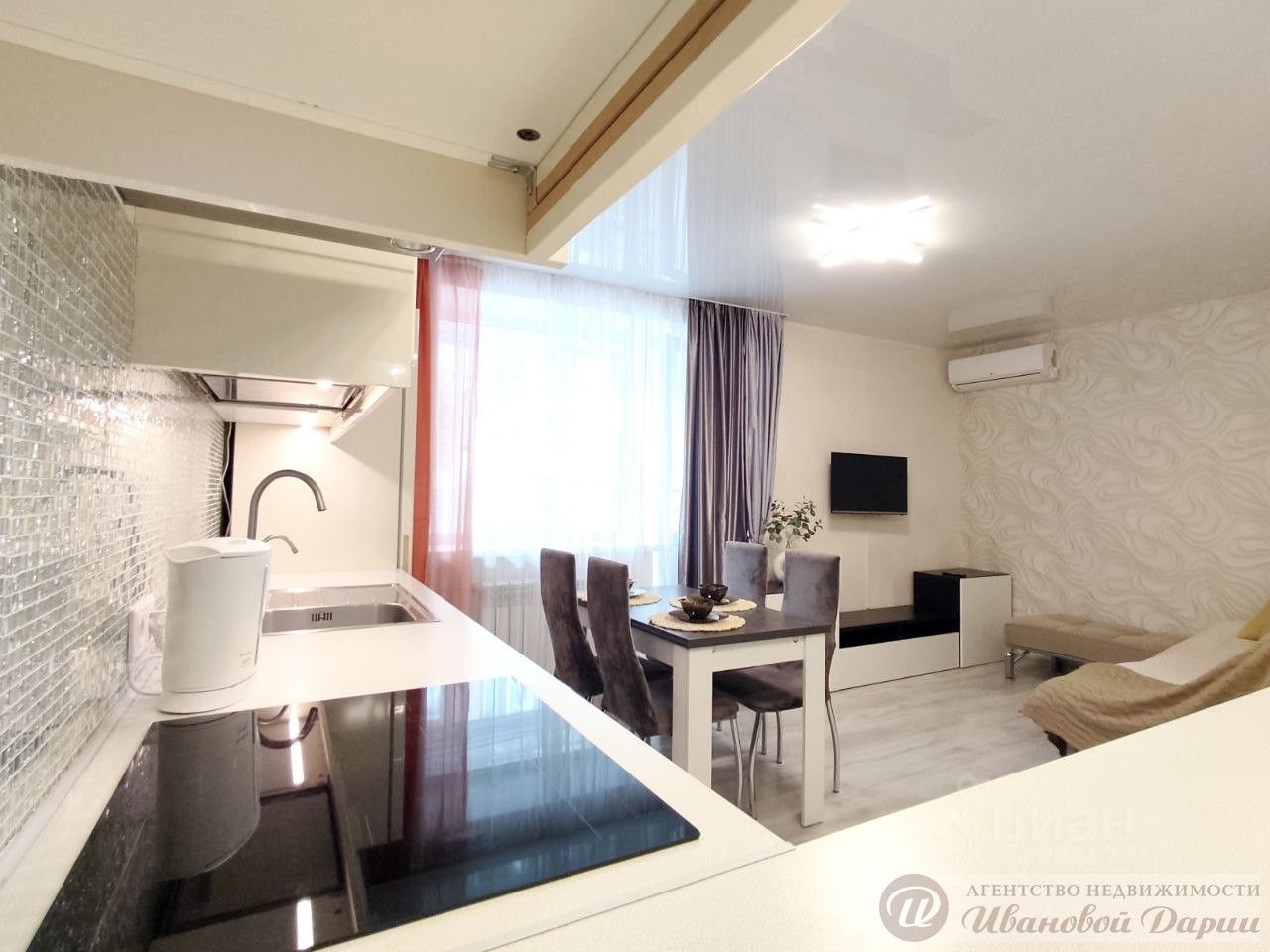 Просторная светлая кухня- гостиная (оснащена смарт ТВ, диваном, кондиционером, обеденной зоной,кухонным гарнитуром с техникой,индукционной плитой и разным кухонным скарбом, в фильтром доя очистки воды, посудомоечной машинкой) в которой можно собираться всей семьёй и вместе проводит совместный досуг.