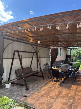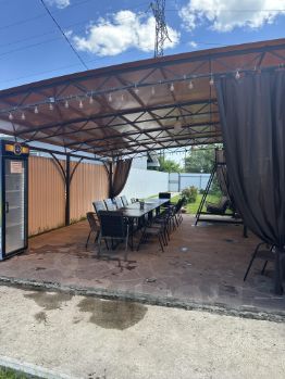 На территории большая терраса со столами , мангальной зоной, большой стационарный уличный бассейн (6*3),
