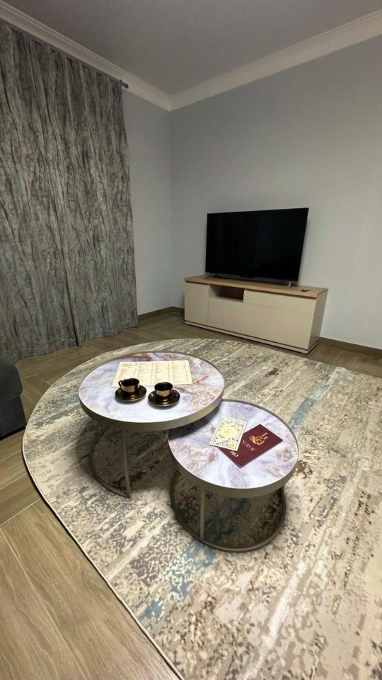 Кухня - гостиная с большим раскладным диваном , тв зоной с Алисой , раскладной стол .