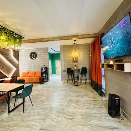 В кухне-гостиной есть несколько столов (по желанию можно сделать свою расстановку), удобные мягкие стулья, TV зона, Колонка, Диван, барная стойка, барные стулья)