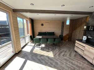 На первом этаже расположена кухня- гостиная 30м. Кв., санузел, душевая кабина, на втором две спальни.