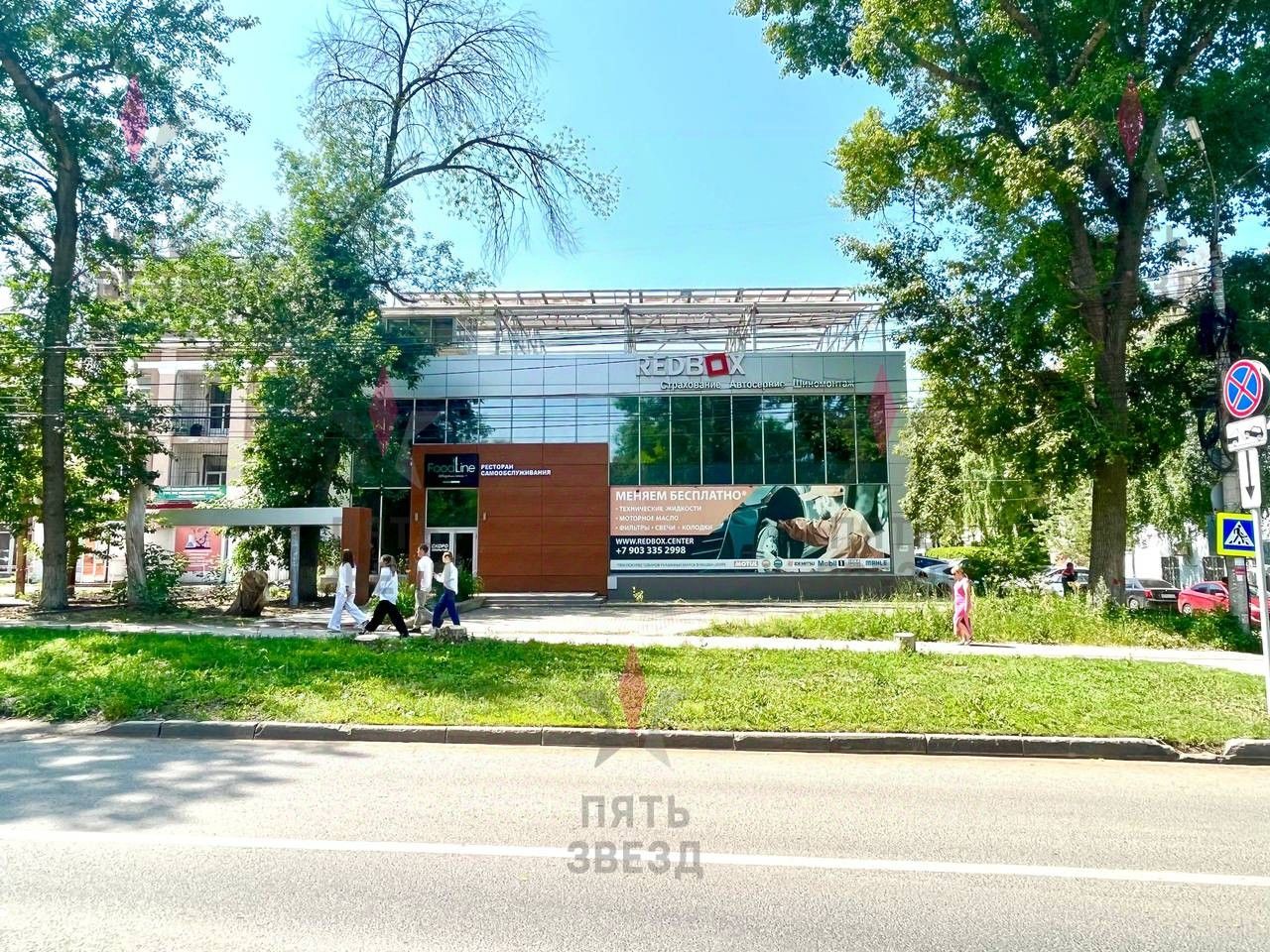 Фасад здания отлично просматривается. Много места для наружной рекламы.