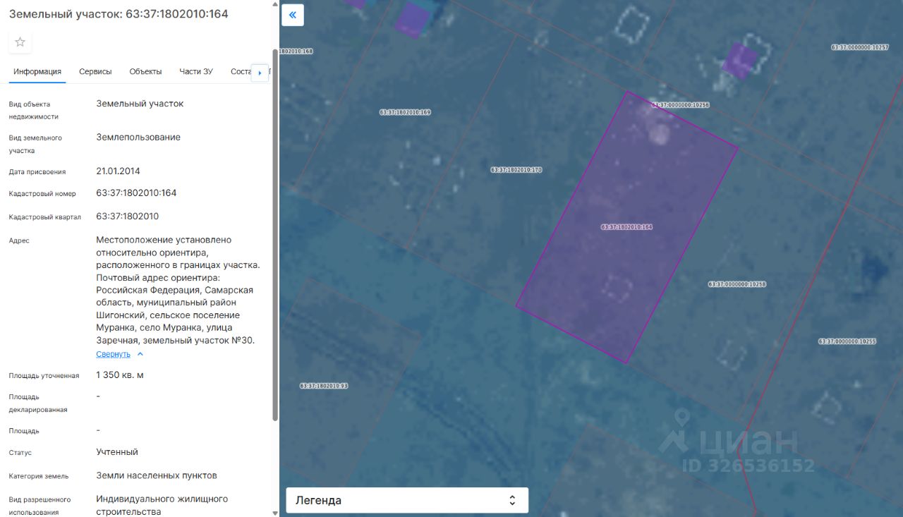 Кадастровый номер земельного участка: 63:37:1802010:164. Местоположение земельного участка: Российская Федерация, Самарская область, муниципальный район Шигонский, сельское поселение Муранка, село Муранка, улица Заречная, земельный участок 30. Площадь земельного участка 1350 кв.м. Разрешенное использование земельного участка: индивидуального жилищного строительства. Земельный участок относится к категории земли населенных пунктов.