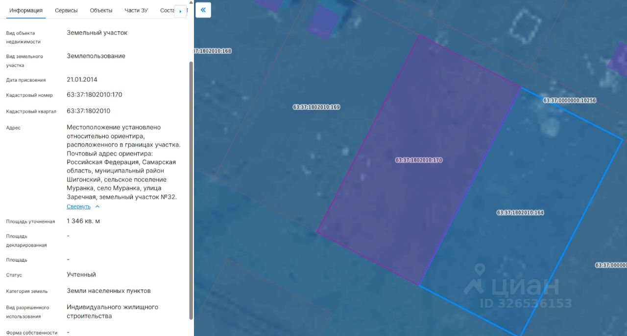 Кадастровый номер земельного участка: 63:37:1802010:170. Местоположение земельного участка: Российская Федерация, Самарская область, муниципальный район Шигонский, сельское поселение Муранка, село Муранка, улица Заречная, земельный участок 32. Площадь земельного участка 1346 кв.м. Разрешенное использование земельного участка: индивидуального жилищного строительства. Земельный участок относится к категории земли населенных пунктов.
