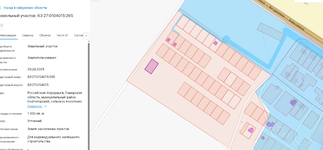 земельный участок, площадью 1000 кв.м., с кадастровым номером 63:27:0104015:265, земли населенных пунктов, расположенный по адресу: Российская Федерация, Самарская область, муниципальный район Нефтегорский, сельское поселение Дмитриевка, село Дмитриевка, Территориальный округ Дмитриевка, с видом разрешенного использования: для индивидуального жилищного строительства