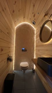 Санузел выполнен на уровне премиальных ресторанов (отделка деревом, подсветка). Кофейня полностью готова стать точкой притяжения для качественной аудитории и создания контента в соцсетях.
