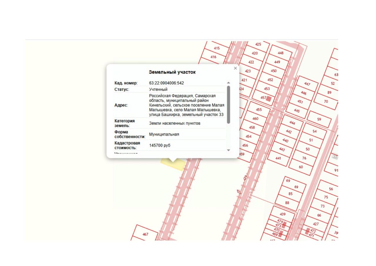 Земельный участкок с кадастровым номером 63:22:0904006:542, площадью 1000+/- 11 кв. м, адрес: Российская Федерация, Самарская область, муниципальный район Кинельский, сельское поселение Малая Малышевка, село Малая Малышевка, улица Башкирка, земельный участок 33