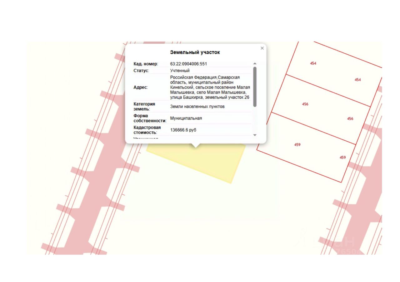 Земельный участок с кадастровым номером 63:22:0904006:551 площадь 938 по адресу Российская Федерация,Самарская область, муниципальный район Кинельский, сельское поселение Малая Малышевка, село Малая Малышевка, улица Башкирка, земельный участок 26