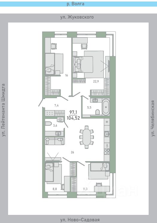 Продаётся 4-комнатная квартира в строящемся доме (Корпус 1), срок сдачи: III-кв. 2027, общей площадью 104.52 кв.м., на 9 этаже. Новый жилой комплекс "Высота" от застройщика "СЗ СПЕКТРСТРОЙ" расположен по адресу Самара, Ново-Садовая улица.