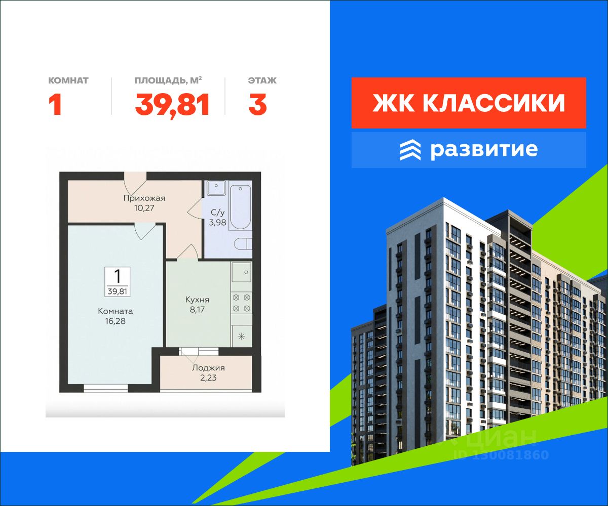 В продаже квартира площадью 39.81 кв. м с черновой отделкой. Квартира находится в жилом комплексе "Классики", на 3 этаже 16 этажного дома. Застройщик - федеральный застройщик ГК "Развитие".