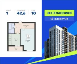В продаже квартира площадью 42.60 кв. м черновая отделка. Квартира находится в жилом комплексе "Классики", на 10 этаже 16 этажного дома. Застройщик - ГК "Развитие".